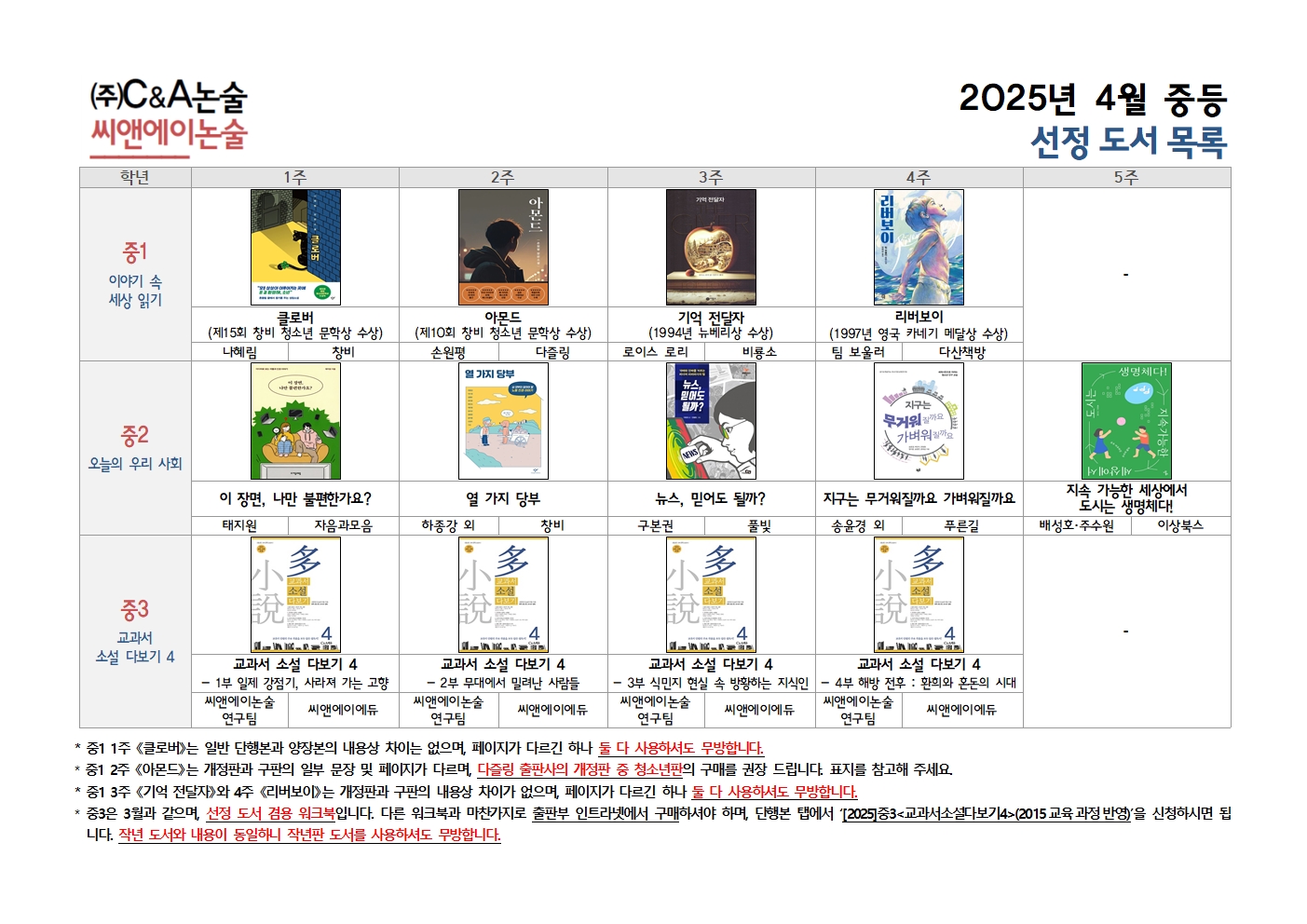 2025년 4월 중등부 선정 도서 및 학습 계획서